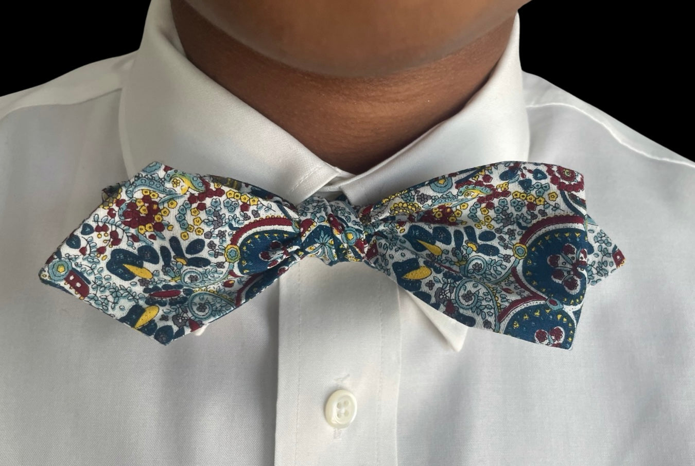Hand-made cotton diamond tip style bow tie. A self-tie bow tie, paired with a matching pocket square. Complement your look with these dapper pieces for all occasions.